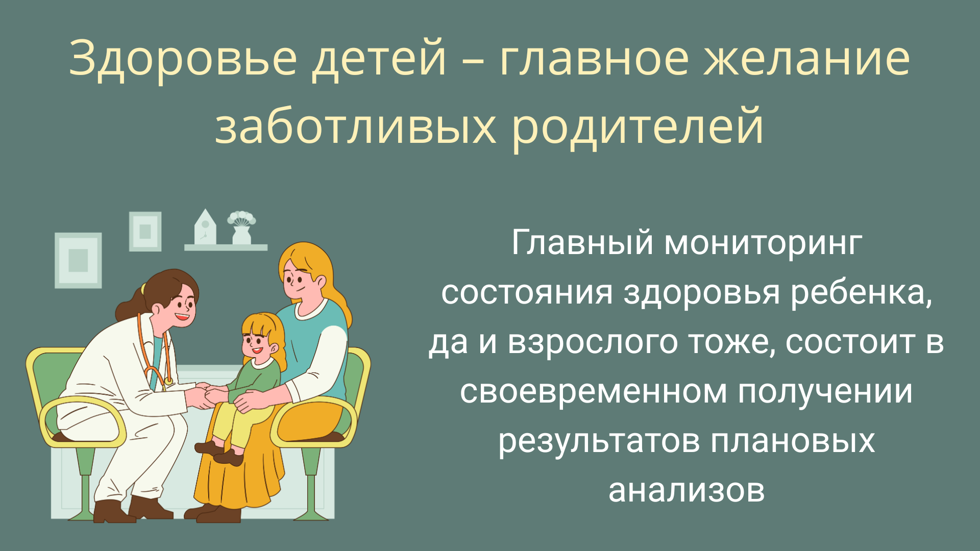 Возможности современной медицины постоянно растут, и все большее количество исследований организма становится для нас доступно. Однако, главный мониторинг состояния здоровья ребенка, да и взрослого тоже, состоит в своевременном получении результатов плановых анализов.